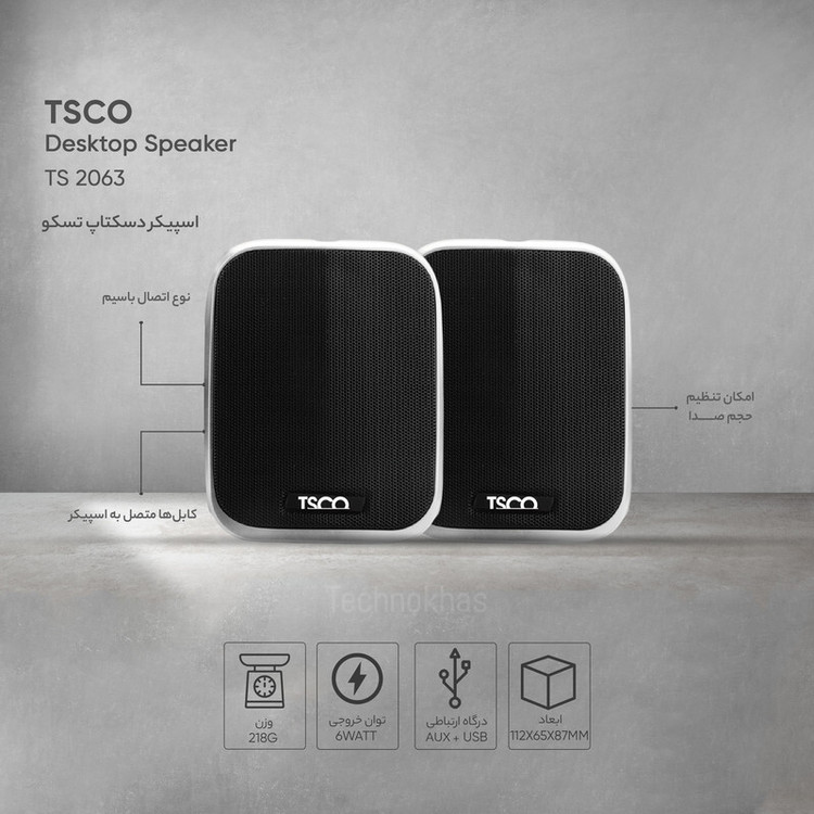 اسپیکر دسکتاپ «تسکو-TSCO» مدل «TS2063» یکی از محصولات باکیفیت و کاربردی این کمپانی است که از امکانات مناسبی بهره برده است. «TS2063» از دسته اسپیکرهای دوتکه است. این وسیله به گونهای طراحی شده است که به راحتی روی میزکار قرار میگیرد و از آن میتوان برای کامپیوترهای دسکتاپ و لپ تاپها استفاده کرد. این اسپیکر برای اتصال به کامپیوتر و انتقال صدا از جک 3.5 میلیمتری استفاده میکند و برق آن از طریق کابل USB تامین خواهد شد؛ بنابراین نیازی به اتصال به پریز برق نخواهد داشت. بر روی یکی از اسپیکرها یک دکمه برای تغییر حجم صدا در نظر گرفته شده است.