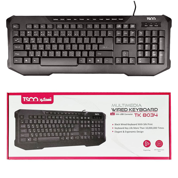 کیبورد تسکو مدل TK 8034 از محصولات منحصر به فرد و خوش ساخت این برند است که از کیفیت بالایی برخوردار است و متریال به کار رفته در تولید آن نیز کیفیتی مطلوب دارد. این محصول در رنگ مشکی طراحی و تولید و روانه ی بازار فروش شده. کیبورد تسکو مدل TK 8034 سیمی است و از طریق پورت USB قابل اتصال به کامپیوتر و یا لپتاپ شماست که طول کابل آن 1.8 متر میباشد که سازگار با انواع سیستم عامل های Win10/8/7/2000/98/XP/ME/NT/vista میباشد. در تولید کیبورد تسکو مدل TK 8034 از 115 کلید و 11 کلید میانبر و کاربردی استفاده شده است که عمر ضربه های آن به 10 میلیون ضربه هم میرسد و همچنین دو چراغ نمایشگر برای کلید های CAPS LUCK/NUM LUCK بر روی کیبورد به چشم میخورد.